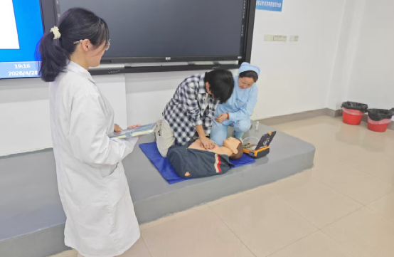 理论讲解结束后,进入实操体验环节。同学们热情高涨、积极踊跃,主动上台练习。在齐丽丽护士的耐心指导下,大家借助模拟人规范操作,及时纠正动作偏差,熟练掌握基础急救要领。