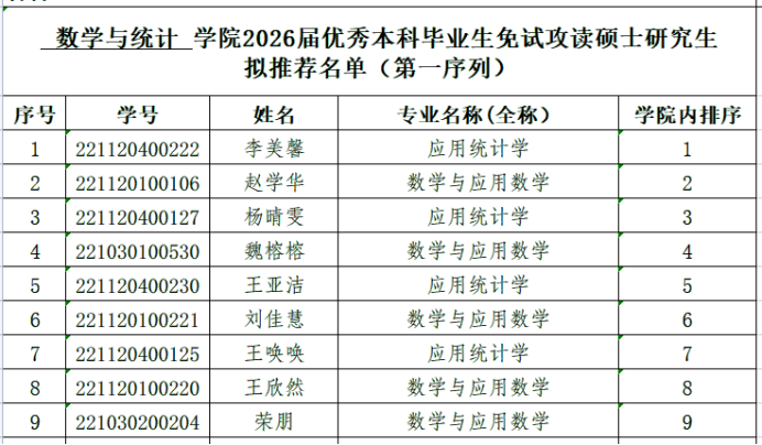 推免生遴选工作小组考察审核审定,我院拟推荐2026届优秀应届本科毕业生免试攻读硕士学位研究生名单公示如下(排名有先后):