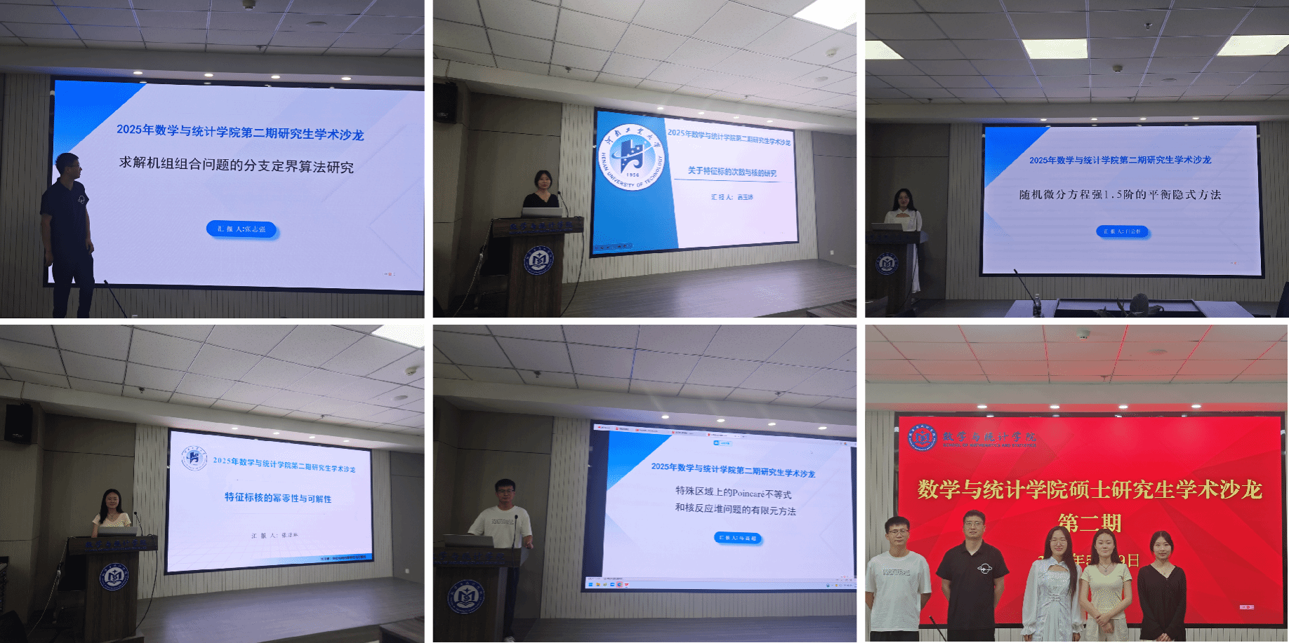 本期学术沙龙由2022级数学专业马高超、白会群、张志强、张洁琳和高玉婷5位硕士研究生分享科研成果,沙龙内容涵盖代数、计算、运筹学等多个研究方向,汇报内容兼具理论深度与应用价值。马高超同学以“特殊区域上的Poincaré不等式和核反应堆问题的有限元方法”为题,探讨了Poincaré不等式的性质以及有限元方法的应用;白会群同学围绕“随机微分方程强1.5阶的平衡隐式方法”,深入分析了随机微分方程的平衡隐式方法;张志强同学则通过“求解机组组合问题的分支定界算法研究”,系统分析了不同算法的适用场景。张洁琳和高玉婷两位同学分别就“特征标核的幂零性与可解性”以及“关于特征标的次数与核的研究”为题,分享了各自在特征标核、特征标次数与有限群性质及结构之间联系的研究成果。现场师生就相关领域的前沿研究热点展开热烈讨论,学术氛围浓厚。