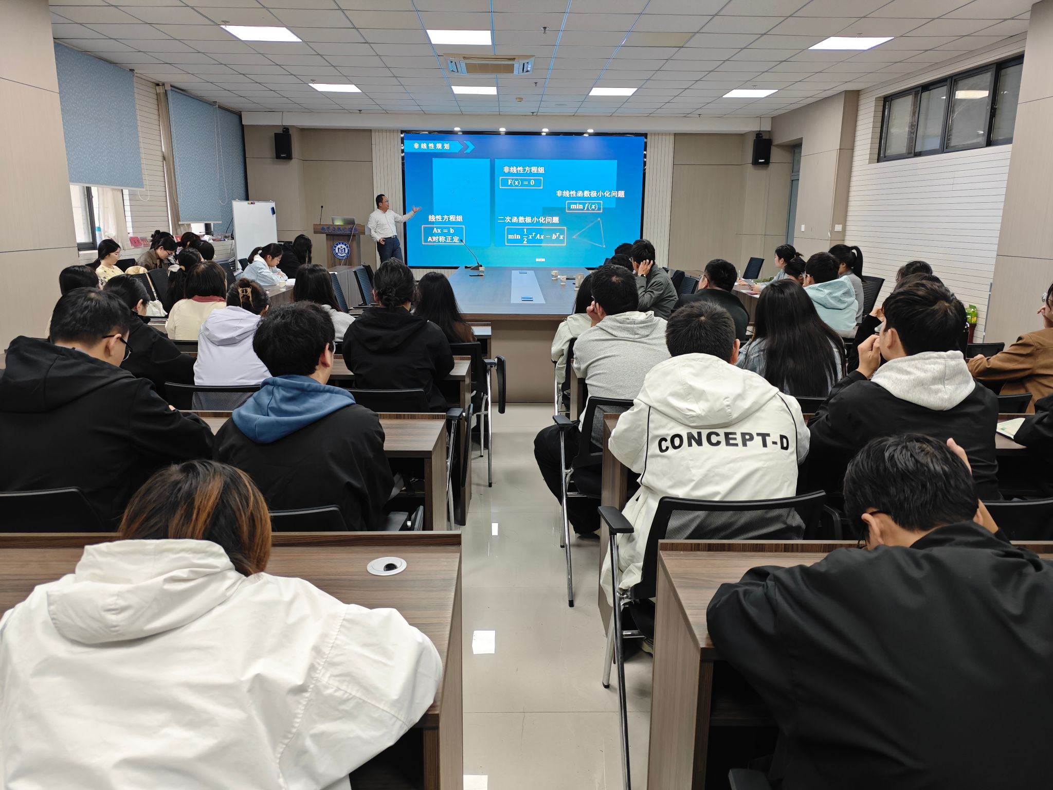 报告会上,肖运海教授首先系统阐述了统计学与运筹学作为人工智能核心数学基础的底层逻辑,指出统计学通过数据特征提取与模型构建进行数据分析,而运筹学则通过算法优化实现数据预测,两者共同构成了人工智能的核心与精髓;随后,他从运筹学的起源入手,清晰回顾了其发展历程、传统优化模型及主流优化求解器,并层层递进地探讨了在人工智能时代背景下,统计方法在机器学习等前沿领域的深度应用;最后,肖运海教授结合自身研究,总结了相关模型的归纳方法与未来发展方向,并介绍了河南大学运筹优化研究团队的概况,真诚希望本报告能激励在场师生于研究中重视运筹学与统计学的应用,并鼓励大家积极报考河南大学数学和统计学研究生。报告会中,与会师生就相关问题与肖运海教授开展了广泛且深入的交流与探讨,现场学术氛围浓厚。